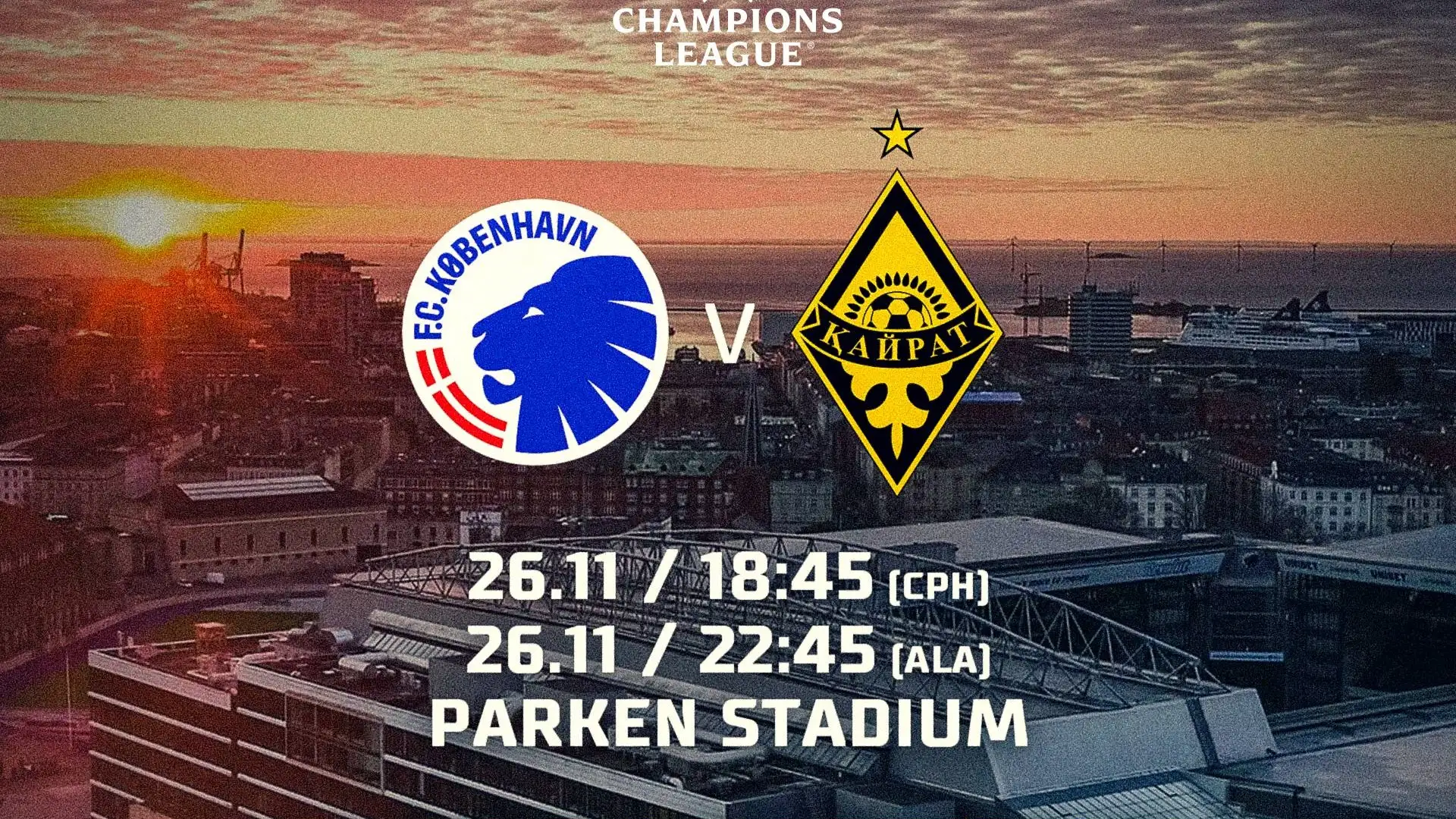 26 ноября в 18:45 по местному времени на стадионе "Паркен" в Копенгагене состоится матч Лиги чемпионов УЕФА — "Копенгаген" – "Кайрат", сообщает пресс-служба алматинской команды.