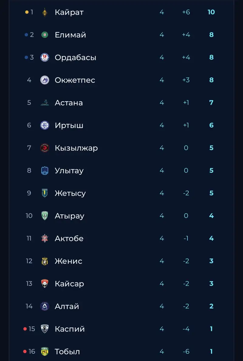 С 4 по 5 апреля прошли все матчи четвёртого тура КПЛ. После их завершения турнирная таблица претерпела несколько изменений. Одним из главных стало определение единоличного лидера — им стал алматинский "Кайрат", который на данный момент имеет 10 очков.