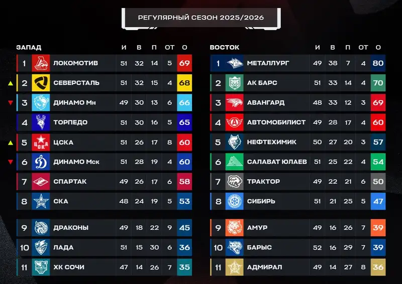 Турнирное положение команд в КХЛ на сегодняшний день выглядит следующим образом: